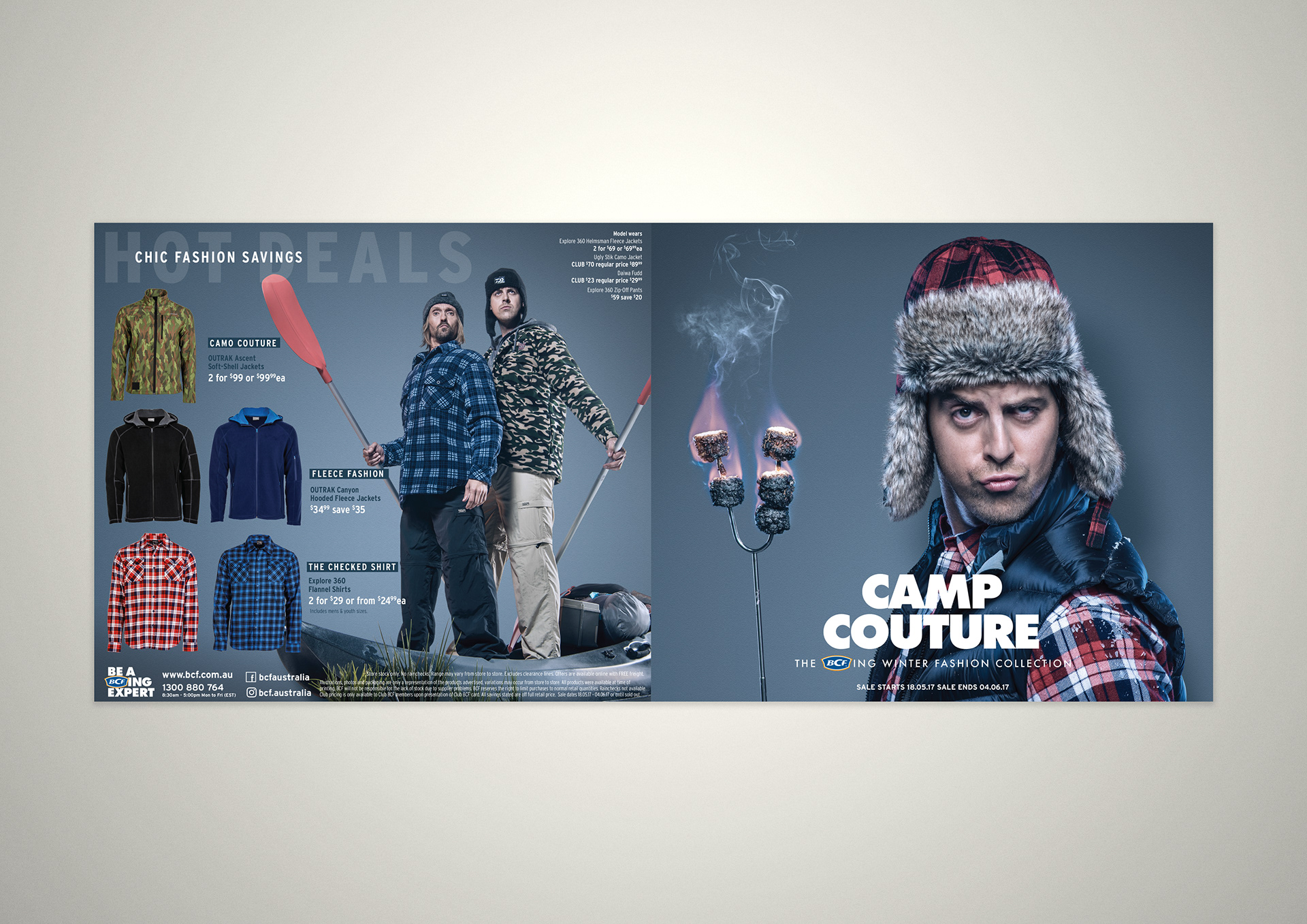BCF wanted to showcase their new luxury winter apparel product ranges in a new-look catalogue. So we decided to satirise the flashy world of modelling and do high fashion 'BCFing style'.