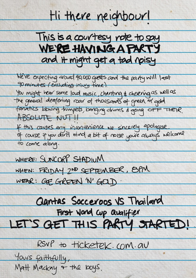 The Socceroos' opening World Cup qualifier against Thailand was billed as one MASSIVE party. So we did the courteous thing and let Brisbane residents know to expect a little extra noise around kick-off time with this neighbourly DM piece.